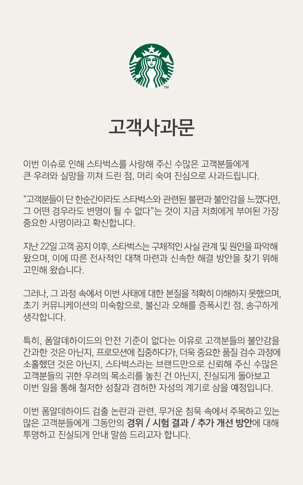 그런데 결국 그 논란을 사실로 밝혀지고 스타벅스코리아에 고객사과문이 올라왔습니다.
