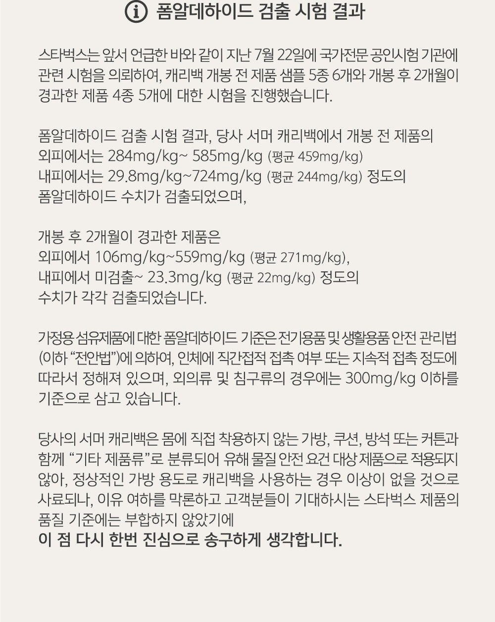 뉴스 기사로 커뮤니티에서 발암물질로 분류되는 폼알데하이드가 검출되었다는 주장이 확산되자 스타벅스 측은 국가 전문 공인기관에 검사를 의뢰해 사실 여부를 확인하고 있다고 했습니다.